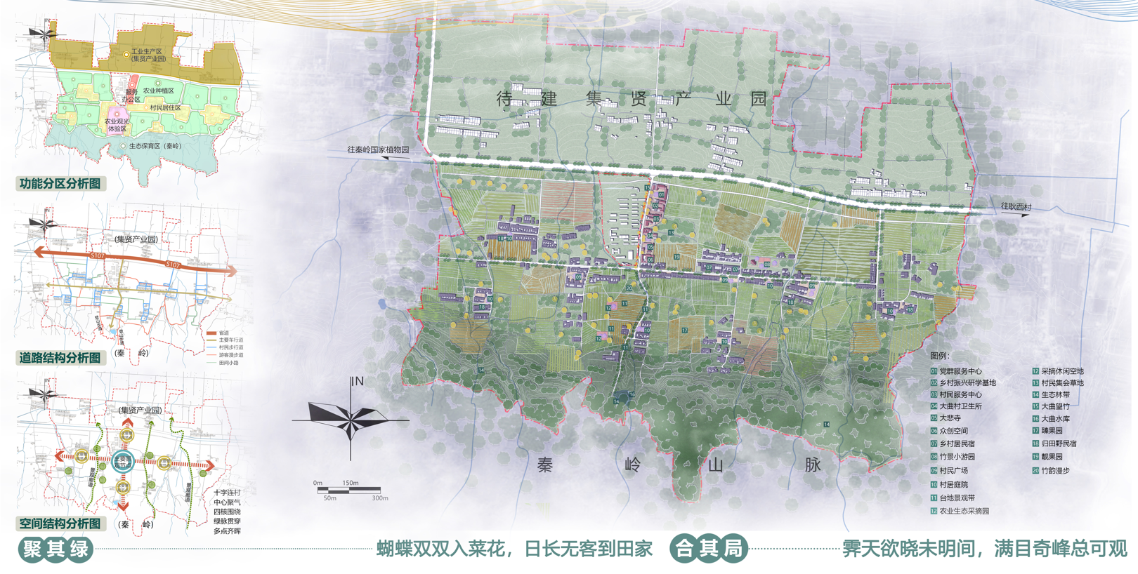 The work takes the Daqu Village at the northern foot of the Qinling Mountains as the planning object. Aiming at the main problems of the villages "invisible ecology, no gathering of spirits, no gathering of spirits, scattered and no gathering of industries", taking the protection of nature as the starting point, organically integrating the form of the village with the ecological environment; rationally dividing industry and life, creating a "green gathering - scattered living" The three-life integration pattern of "Heye" stimulates the endogenous development momentum of the village. Further explore the functional layout of decentralized villages, the typical mode of environmental improvement, and create a rural landscape with a harmonious environment. Form a sustainable development model of "integration of three lives, dynamic coordination".