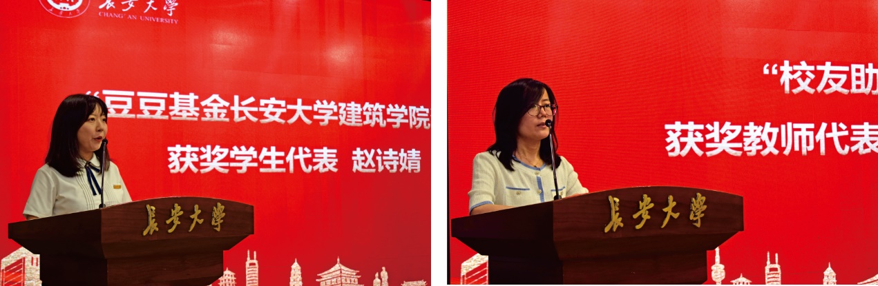 “思想信念坚定为先,科研创新勤奋为先,服务社会奉献为先。”获奖学生代表赵诗婧同学发出的时代强音,是作为新时代青年的责任与担当。“把握我国学科发展方向,关注学生成长,争做新时代的奋斗者。”教师代表段亚琼老师结合当今时代要求,国际形势,提出着力培养人才,进行科研创新,并向优秀校友陈晓红先生、“豆豆基金”创立者尹爱勤女士表示感谢。