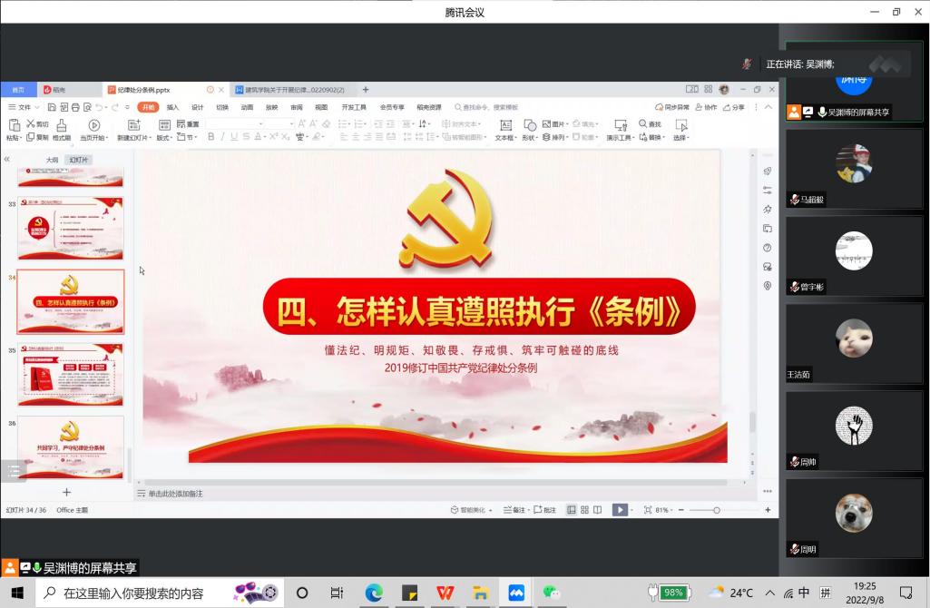 为落实全面从严治党要求和立德树人根本任务,根据学校开展纪律教育学习宣传月和师德师风宣传教育月活动的部署要求,久久小说 本科生第一党支部于9月8日展开“严守纪律规矩 加强作风建设”学习活动,久久小说 本科生第一党支部全体成员参加此次活动。通过纪律学习,提高支部成员的法纪意识,加强纪律作风建设,筑牢拒腐防变思想,廉政文化进一步升华,一体推进不敢腐、不能腐、不想腐成效显现。活动由吴渊博同志主持。