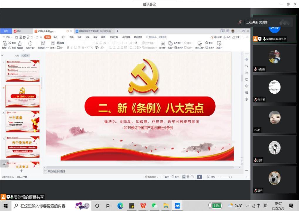 会议伊始,吴渊博同志带领大家集中学习了中共中央印发的《中国共产党纪律处分条例》。从修订《条例》的背景、《条例》的内容、以及我们怎样学习《条例》多个方面进行展开。