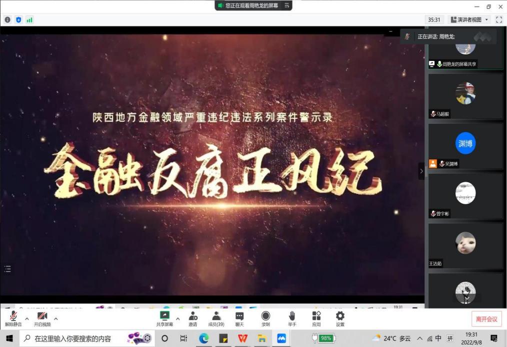 会议第二部分,周艳龙老师带领大家观看陕西地方金融领域严重违纪违法系列案件警示录《金融反腐正风纪》,让我们深刻认识到党员干部捍卫“两个确立”、做到“两个维护”的重要性。警示教育片深刻警示广大党员干部要严守政治纪律和政治规矩,牢记廉洁纪律,强化底线思维,自觉接受监督,持续深入推进党风廉政建设和反腐败斗争,以风清气正的政治生态环境迎接党的二十大胜利召开。
