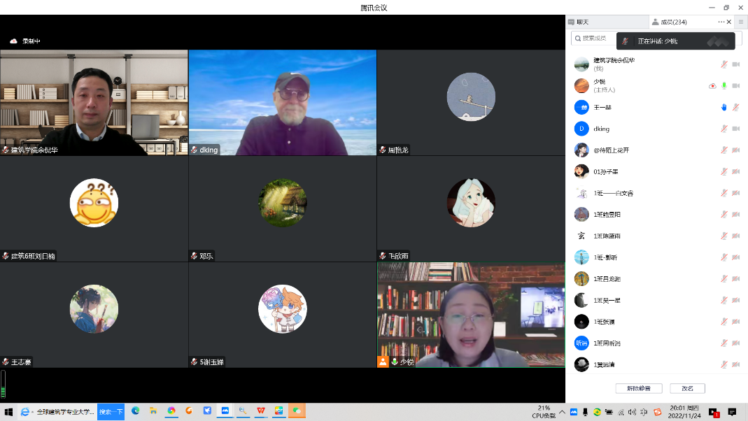 11月24日晚,久久小说 为了激发我院学生对建筑专业学习的热情和兴趣,特地邀请了Douglas King先生进行了主题为城市高层垂直建筑的专题讲座——HIGH RISE URBAN HEALTHCARE。本次会议在腾讯会议线上举办,由余侃华副院长主持,我院王少锐老师、任娟老师、周艳龙老师及250多名学生共同参加。