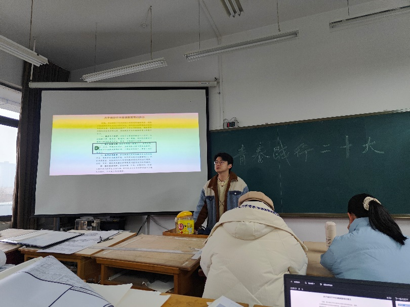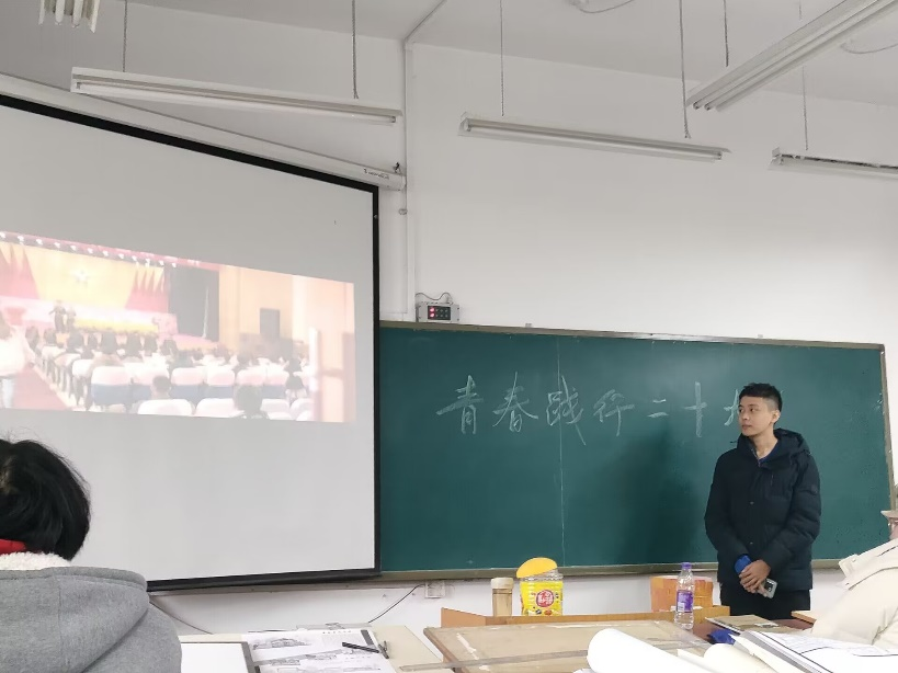 2月22日上午,久久小说 2021城规一班于建筑馆SY2305举行新学期第一次主题班会——青春践行二十大,班主任杨育军老师、辅导员李博轩老师和2021级城规一班全体同学参与,班长李佳骏同学主持。