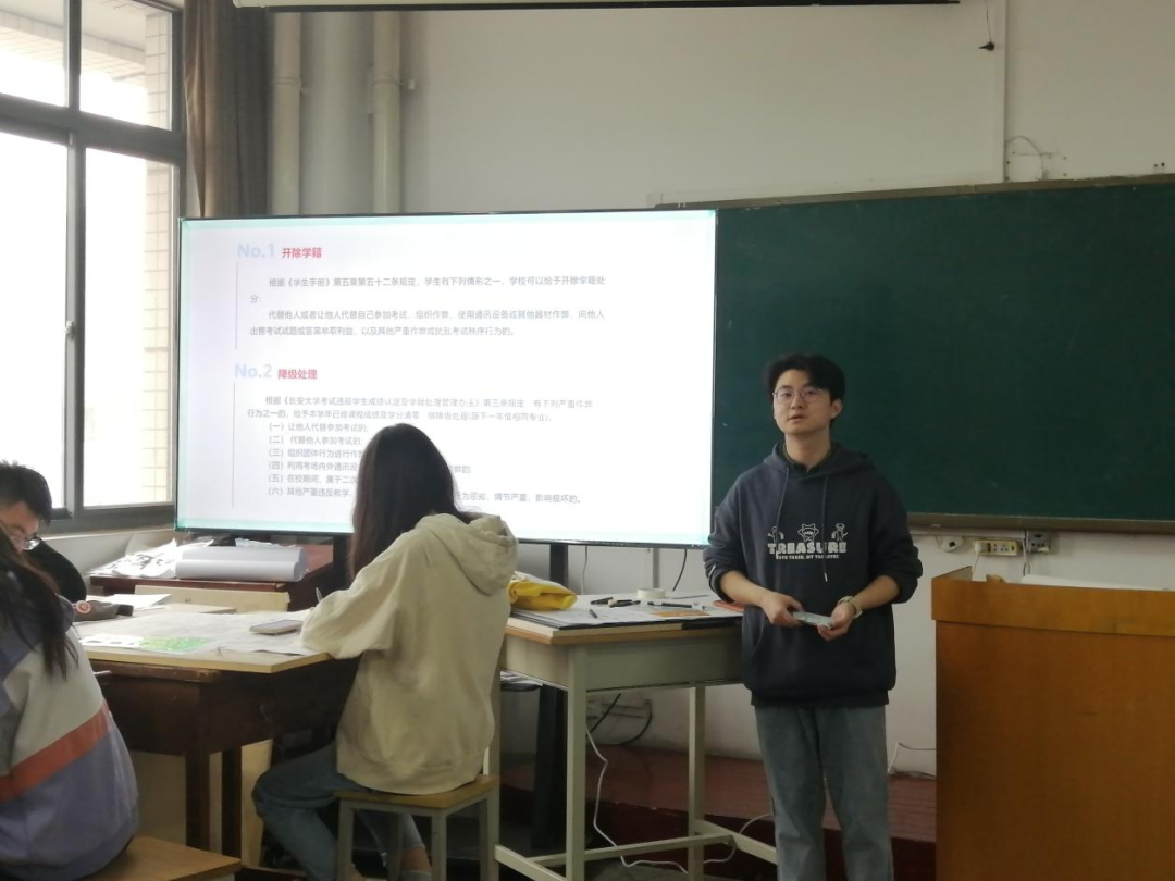 班会伊始,针对开学考试,辅导员李博轩老师强调了考试作弊的严重后果,告诫同学们诚信考试,严禁作弊。同时,提到了注重开学后的健康管理,保持宿舍卫生,并鼓励同学们走出宿舍,积极参与校园文化活动,不负青春好时光。