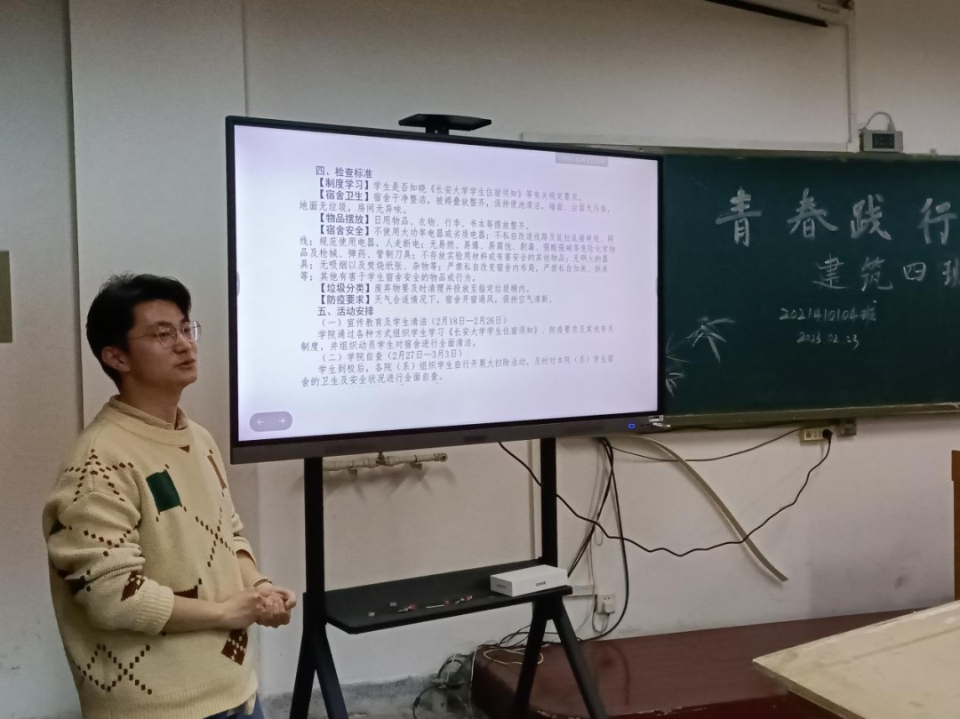 2023年2月20日下午,2021级建筑学一班第一次班会于专教正式召开。出席本次会议的有班主任解学斌老师、辅导员落昊飞老师和全体建筑学一班同学。