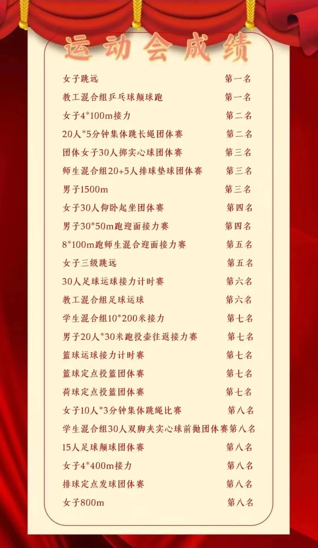 少年自有星光,低头是跑道,抬头是梦想。我院女子4×100接力比赛获得第二名。女子仰卧起坐获得第二名。男子30人×50米迎面接力赛获第四名。10×200m接力获得第七。