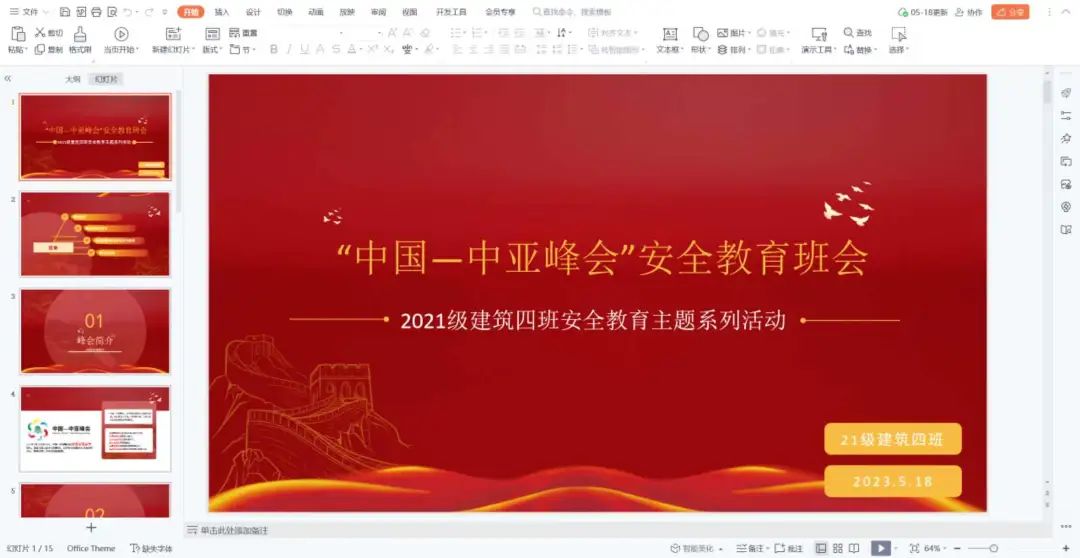 2023518日至19日,中国—中亚峰会将在在陕西省西安市举行。为响应党的号召,提高同学们的政治意识和安全意识,促进峰会的顺利进行,518日晚上,2021级建筑四班举行了“中国—中亚峰会”政策宣贯与安全教育主题班会。本次班会由班主任王少锐老师组织,班长李佳玉同学主持,团支书李晨扬同学发言,2021级建筑四班全体同学参加。