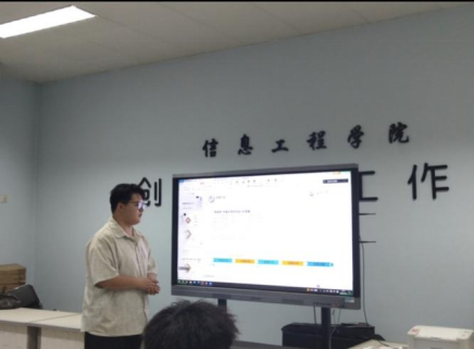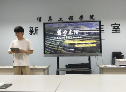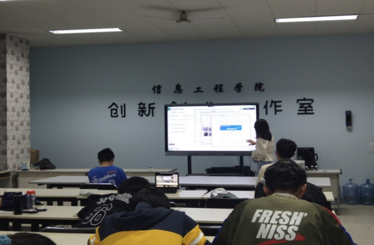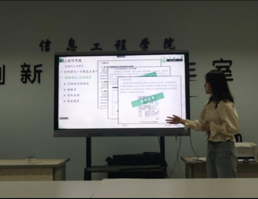 会议开始后,首先由信息学院崔茜璇对挑战杯创赛展开介绍,并分享了答辩经验和答辩ppt ,讲解如何调研实践设计一体四翼的有田助农模式和推出了智慧农田和智慧养殖方案。