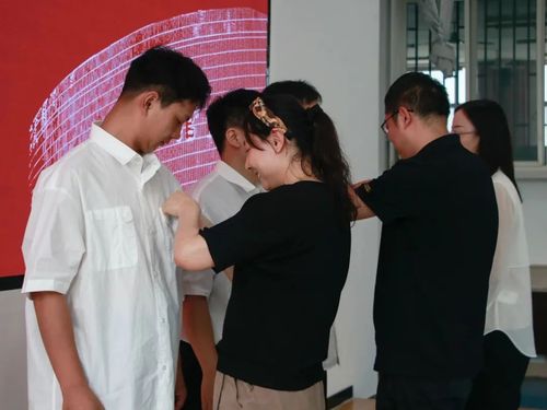 最后,久久小说 研究生导师代表任娟、周吉喆、朱秋晨为2023级新生代表佩戴校徽并合影留念。