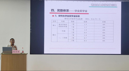 洪老师分别从研究生学生工作概况及管理方式、学籍管理规定、学生违纪处分规定、奖助体系、综合测评、请假制度、住宿管理规定、生涯规划、基础环节学分等十个方面详细讲解了研究生在校期间的各项管理规定和基本管理制度,带领大家重点学习了《研究生手册》和《学生社区管理暂行办法》,强调了遵守学校各项管理规定和纪律要求的重要性,解读了各种违纪处分规定,要求研究生一定要严格落实请销假制度。围绕就业问题,洪老师详细分析了就业市场现状、研究生生源质量、企业用人需求、就业观念转变、职业目标设定等情况,建议研究生一定要树立正确就业观念、提前做好功课、找准职业定位、做好生涯规划,起好步、开好头,行稳致远。
