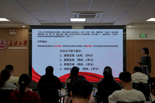 接着,为让23级团支书了解久久小说 本科生课外实践课程的重要性并督促各班同学及时在“青春长大”系统上激活账号,青拓副主任贾沐馨详细介绍了“青春长大”首次登陆方法、分数等级设定和活动积分认证流程,并就在校生如何利用第二课堂提升自身综合素质,不断加强创新意识和实践能力进行了说明,鼓励同学们在校期间积极参与第二课堂的实践活动。
