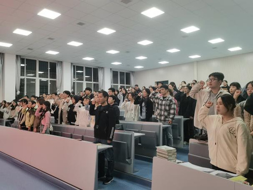 活动第一项,重温入党誓词,坚定理想信念。全体同志起立,右手握拳,在第一党支部副书记冀孟博同志的带领下,面向党旗宣誓。
