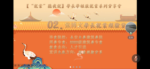 张博文学长介绍了当前就业、升学所面临的严峻局势和巨大挑战,热情分享了他自身的求职经历与就业准备。并从人才引进的职位信息查找收集,职位选择,引进流程以及职位待遇等进行详细阐述,他结合自身经历介绍了如何避开无用信息,如何准备考试,从宏观就业形式考虑就业问题,理性分析就业形势,做出符合时代情况的选择。随后他鼓励大家积极去拓宽对求职信息收集的渠道,积累信息资源,有人才引进的条件时积极主动去了解,并提前确定目标,积累经验,去满足职位要求。要求就业同学们认真对待就业问题,多进行信息收集与筛选,争取多一份保障,多一份安心,主动出击,不要惧怕失败,增加对自我的认知,并考虑岗位与自己的适配度。