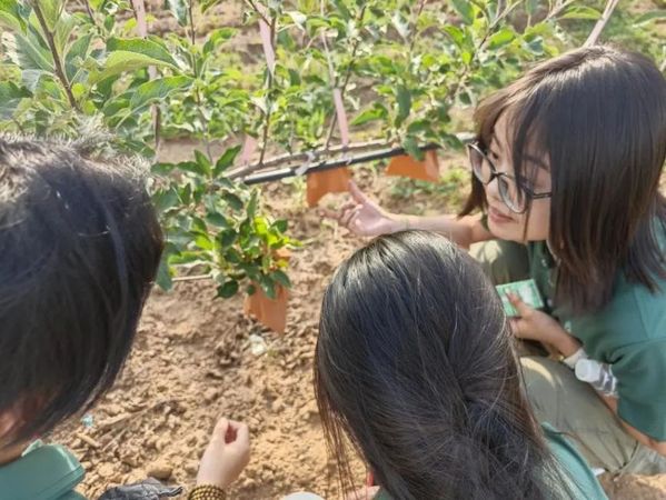 实践队队员观察苹果育苗情况