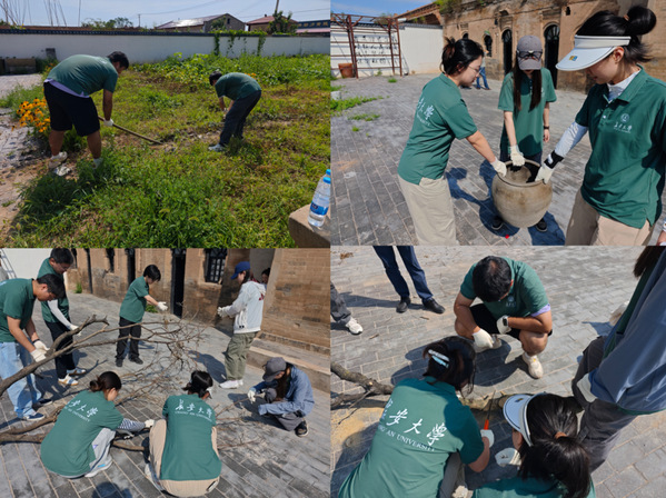 明清窑洞院落中,队员们分工明确,搬菜坛、抬石碾、种花卉……将前期调研中确定的特色乡土材料集中在院子内,测定位置后,队员们原本设计图纸的基础上,继续深入调整优化。经过数个小时的努力,“枯木逢春”主题园艺小品逐渐呈