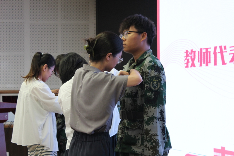 教师代表为2024级本科生代表们佩戴校徽并合影留念。