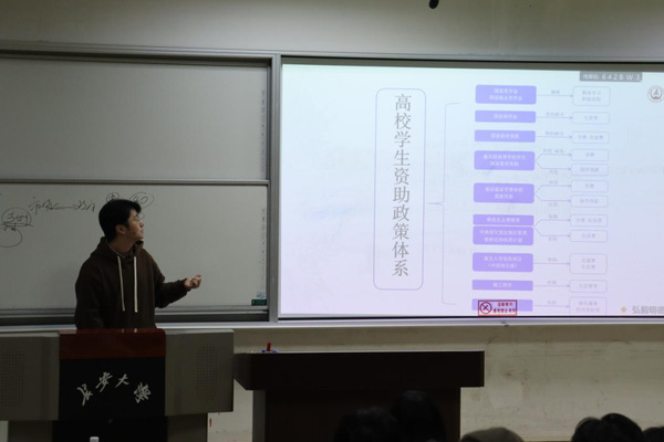 会上,学院资助专干李博轩老师为同学们详细介绍了学校学院奖助学金的具体类别、名额分配原则、评定评选要求、申请时间等相关内容,让学生进一步了解国家、社会和学校相关的一些资助政策,解决了同学们关于资助的疑惑,使资助政策深入每个人的心中。