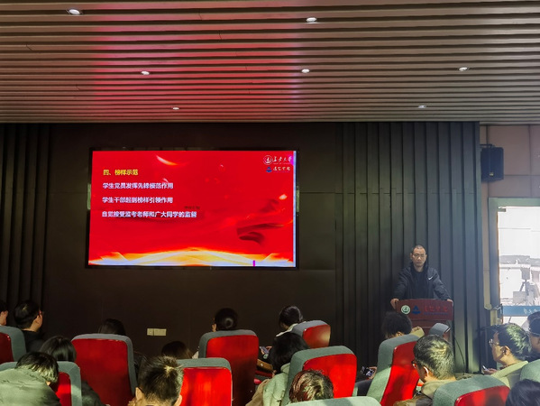 最后,王杰老师号召研究生党员和学生干部要提高思想站位,高度重视学风考风营造,切实发挥好先锋模范作用,凸显出榜样引领作用,带动身边同学“端正考风严肃考纪,诚实做人诚信应考”,自觉接受监考老师和广大同学的监督。