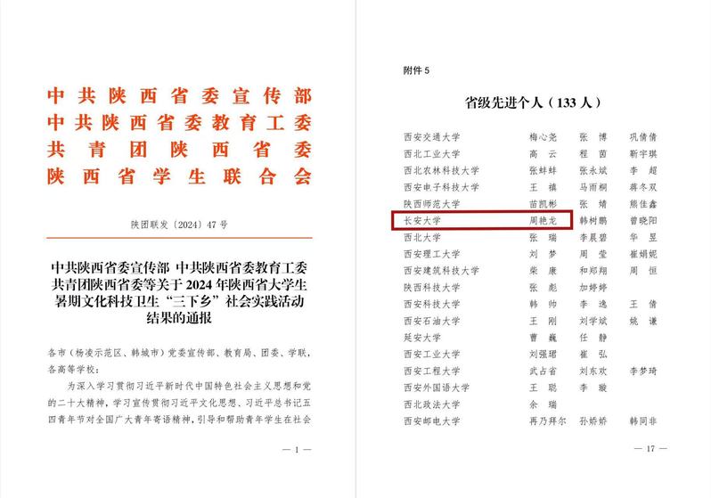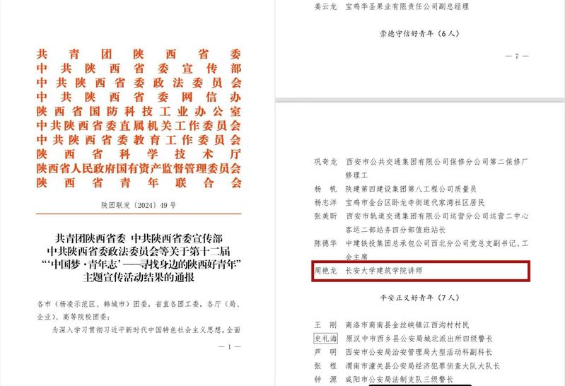 近日,我院辅导员周艳龙分别荣获第十二届“‘中国梦·青年志’——寻找身边的陕西好青年”主题宣传活动“陕西崇德守信好青年”称号和2024年陕西省大中专学生暑期文化科技卫生“三下乡”社会实践活动 “省级先进个人”称号。