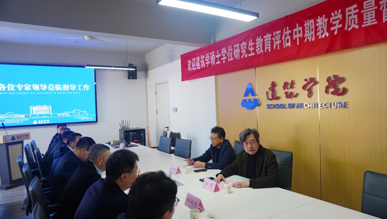 裴建中代表学校对专家组莅临学校指导工作表示欢迎与感谢,并从发展现状、人才培养、科学研究、社会服务等方面介绍了学校和学院的基本情况。李昊代表专家组介绍了进校督察工作安排。会上听取了建筑学专业刘启波教授关于本轮评估周期以来建筑学专业硕士研究生教育建设发展情况汇报。