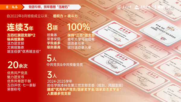 思想铸魂,凝聚奋进力量。2021410201班始终以党团建设为核心,筑牢思想根基。班级现有中共党员5人,全员递交入党申请书,连续两年蝉联校级“五四红旗团支部”,20余人次获评“魅力团支书”“优秀共青团干部”等荣誉。3名支部核心成员参与打造的支部,成为学院“优秀共产党员最多、国家奖学金获得者最多”的王牌支部,让思想引领切实转化为集体发展的核心竞争力。